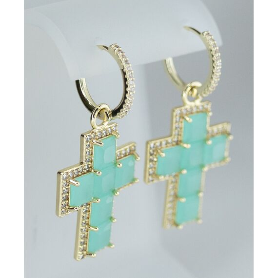 Серьги женские из гипоаллергенного ювелирного сплава желтого цвета. Вставка- ювелирное стекло белого цвета и бирюзовый улексит. Высота серег-3,0см, ширина- 2,5см. Застежка- английская (штифт-1,0см).