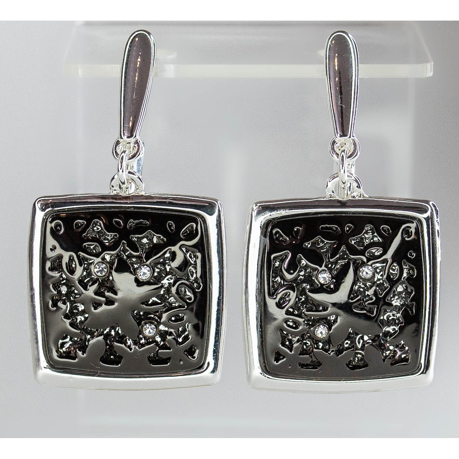 Серьги из гипоаллергенного ювелирного сплава черного и серого цвета. Вставка- ювелирное стекло, цвет- белый. Английский замок (швенза- 1см). Высота серег-3,5см, ширина-2см.
