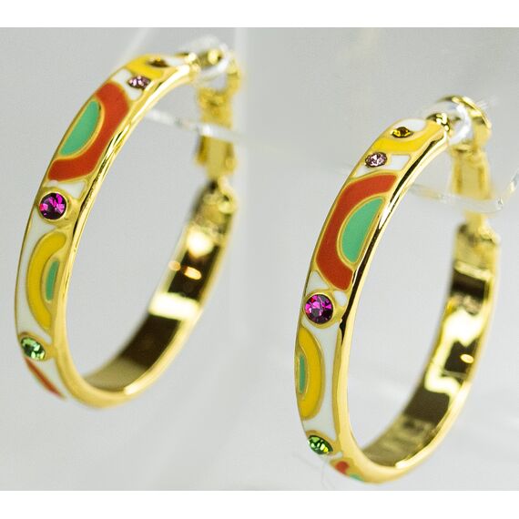 Серьги из гипоаллергенного ювелирного сплава желтого цвета. Покрытие эмалью белого, желтого, оранжевого цвета. Вставка- ювелирное стекло, цвет-зеленый, розовый. Диаметр серег-3,0см.Застежка-итальянская ( швенза-1,2см и клипса).