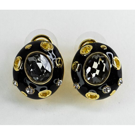 Серьги из гипоаллергенного ювелирного сплава желтого цвета. Покрытие эмалью черного цвета. Вставка- ювелирное стекло белого и серого цвета. Высота серег-2см, ширина -1,5см. Итальянский замок (швенза-1,2см и застежка- клипса).