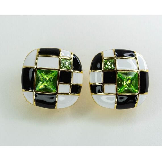 Серьги из гипоаллергенного ювелирного сплава,цвет- желтый. Покрытие- эмаль, цвет- черный, белый. Вставка- ювелирное стекло, цвет- зеленый. Серьги с итальянским замком (длина швензы- 1,2см, застежка- клипса.