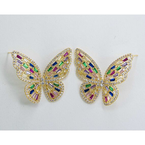 Серьги из гипоаллергенного ювелирного сплава желтого цвета. Вставка- ювелирное стекло белого, красного, синего, зеленого, желтого цвета. Высота серег-3см, ширина-3см. Застежка- пусет.