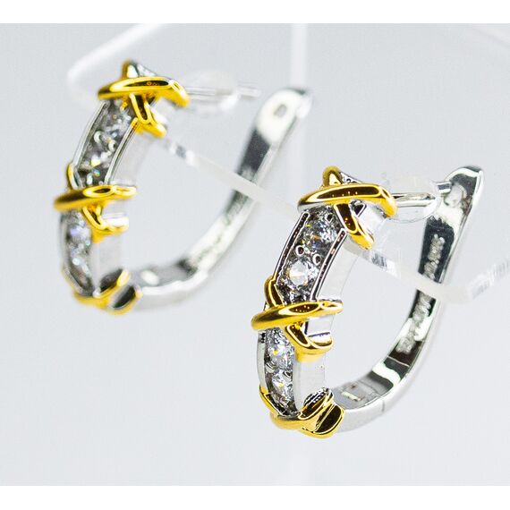 Серьги из гипоаллергенного ювелирного сплава серого и желтого цвета. Вставка- циркон, цвет- белый. Высота серег-1,5см, ширина-0,4см. Английский замок ( швенза-1см).