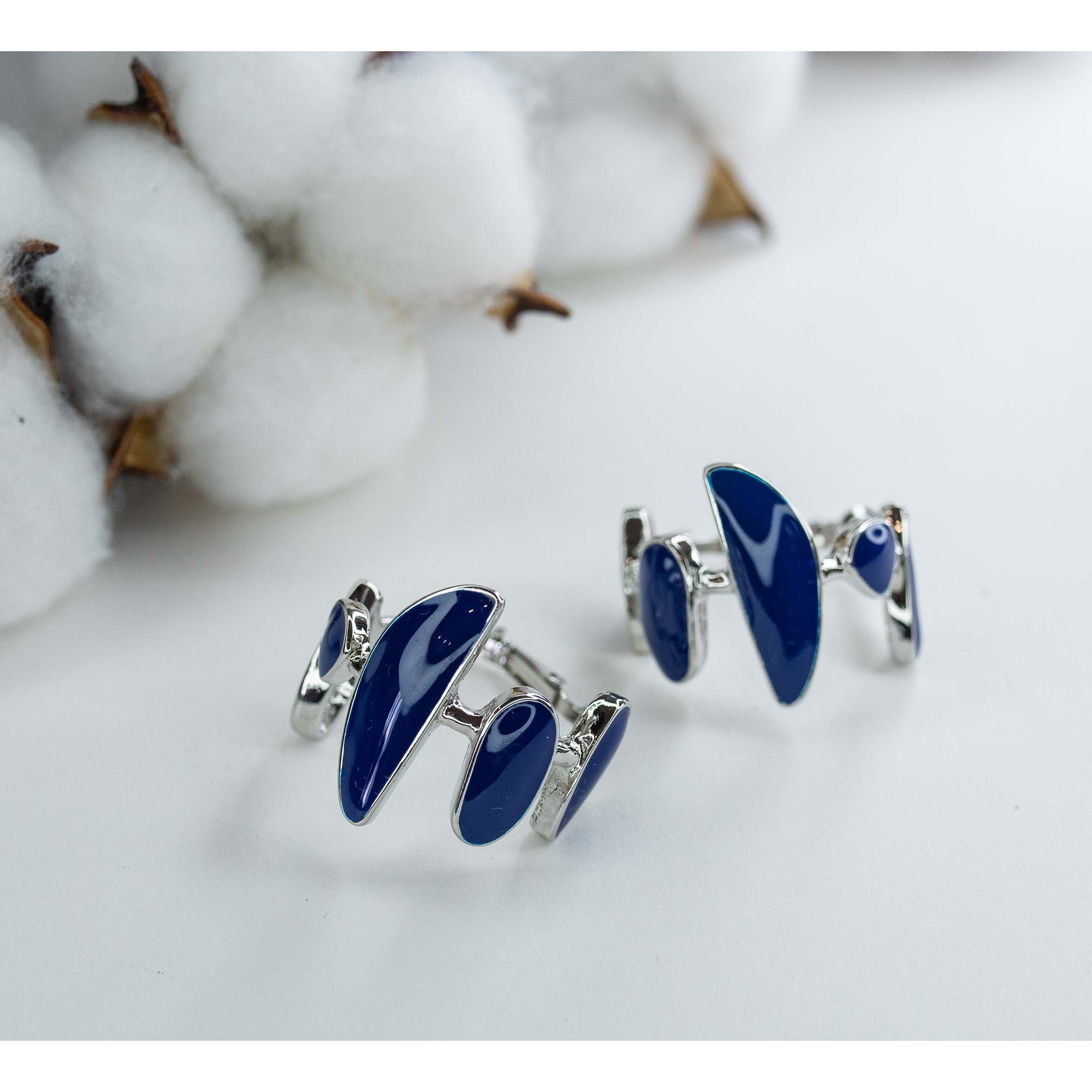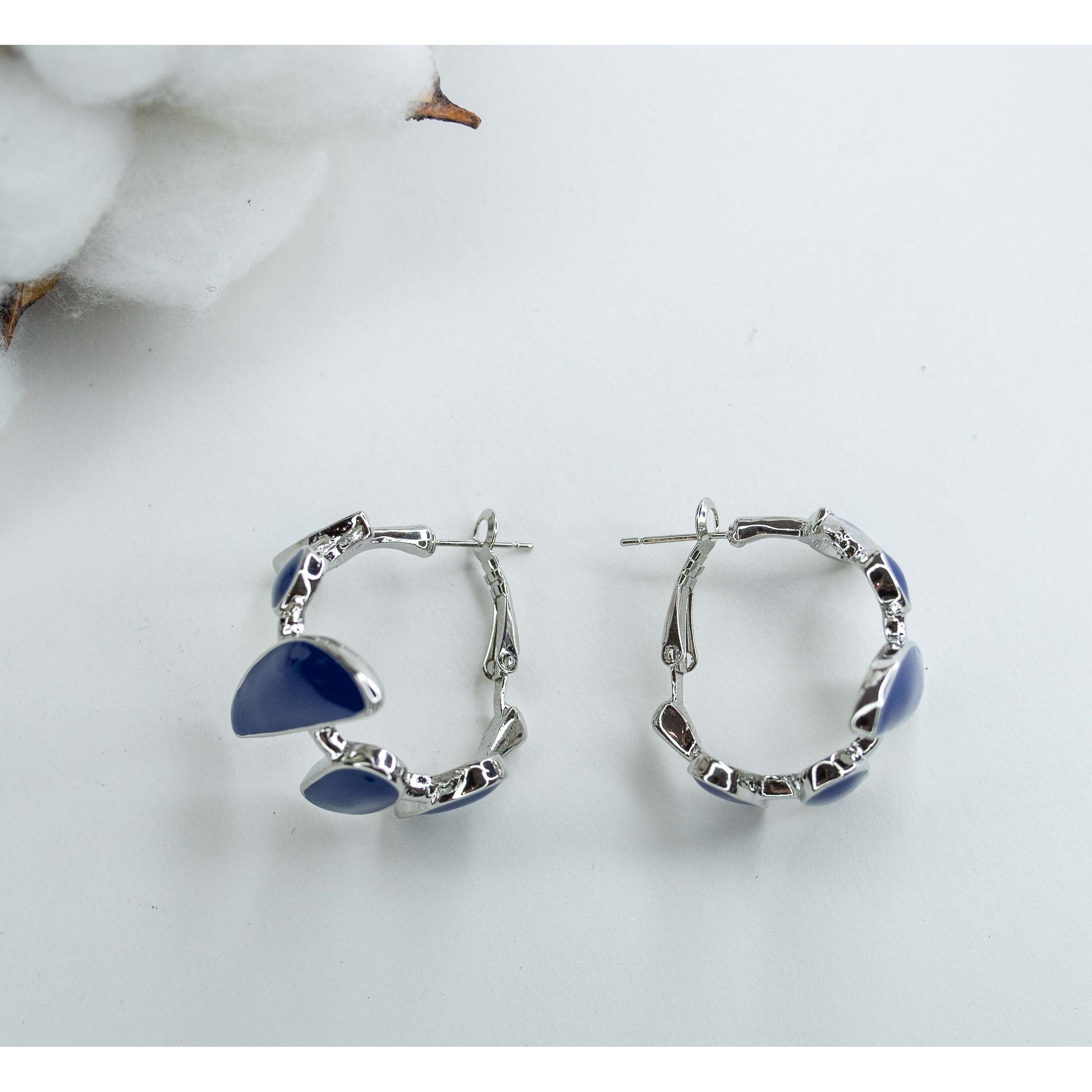 Серьги из гипоаллергенного ювелирного сплава серого цвета. Без вставок. Покрытие эмалью синего цвета. Итальянский замок ( швенза-1,2см и застежка- клипса). Высота серег-3см, ширина -2,5см.
