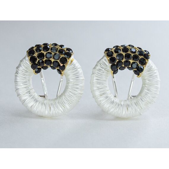 Серьги из гипоаллергенного ювелирного сплава серого и желтого цвета. Вставка- ювелирное стекло черного цвета.Итальянский замок ( швенза-1,2см и застежка- клипса). Высота серег-2см, ширина-2см.