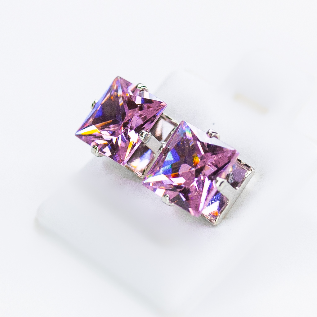 Серьги из гипоаллергенного ювелирного сплава серого цвета. Вставка- ювелирное стекло розового цвета. Высота серег и ширина-0,5см. Застежка- пусет.