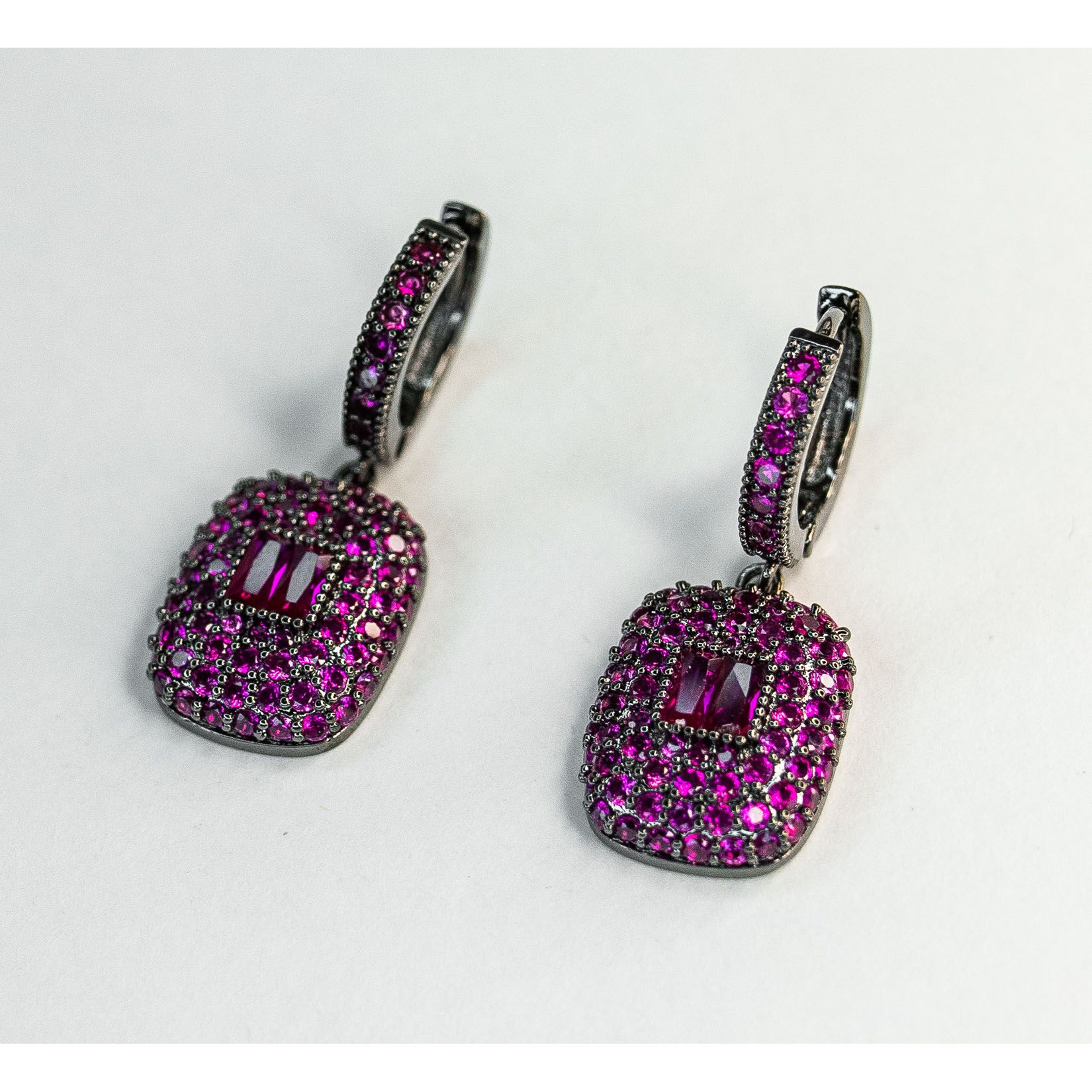 Серьги из гипоаллергенного ювелирного сплава черного цвета. Вставка- циркон сиреневого цвета. Высота серег-3см, ширина-1,2см. Застежка-скоба.