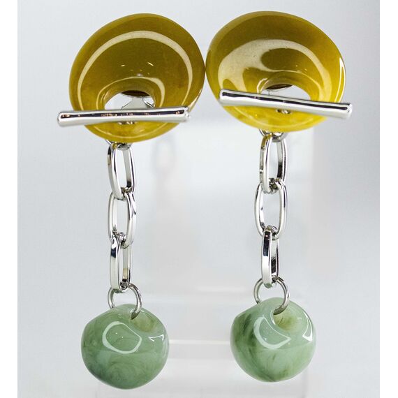 Серьги из гипоаллергенного ювелирного сплава серого цвета . Вставка- пластик зеленого и желтого цвета. Итальянский замок (швенза-1,2см и застежка-клипса). Высота серег-6см, ширина-2,2см. Подвесная часть- шар на цепи (диаметр-1,5см).