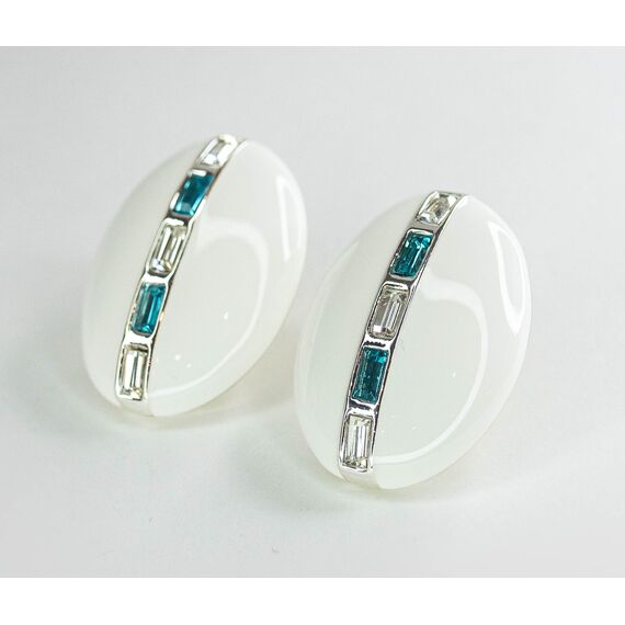 Серьги из гипоаллергенного ювелирного сплава серого цвета. Покрытие эмалью, цвет- белый. Вставка- ювелирное стекло голубого и белого цвета. Высота серег-3,5см, ширина-2,5см. Итальянский замок( швенза-1,2см и застежка-клипса).
