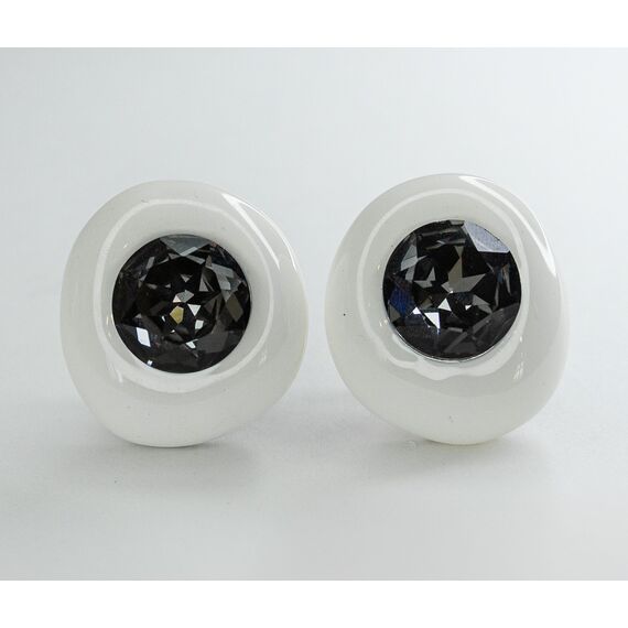 Серьги из гипоаллергенного ювелирного сплава серого цвета. Покрытие эмалью, цвет- белый. Вставка- ювелирное стекло коньячного цвета. Высота серег-3см, ширина-2,5см. Итальянский замок( швенза-1,2см и застежка-клипса).