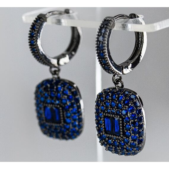 Серьги из гипоаллергенного ювелирного сплава черного цвета. Вставка- ювелирное стекло, цвет- синий. Застежка- скоба. Высота серег-2,5см, ширина серёг-1см.