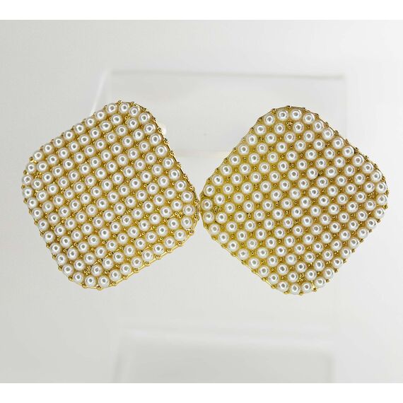 Серьги из гипоаллергенного ювелирного сплава желтого цвета. Вставка- иск. жемчуг белого цвета. Застежка- пусет. Высота серег-2,5см, ширина-2,5см.