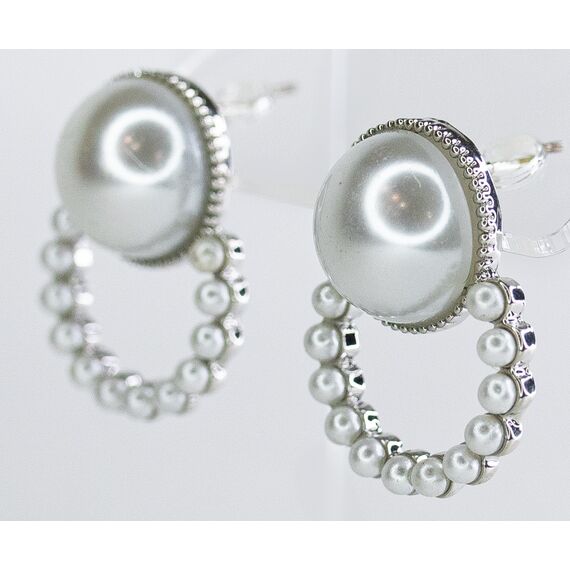 Серьги из гипоаллергенного ювелирного сплава серого цвета. Вставка- иск. жемчуг белого цвета. Застежка- пусет. Высота серег-2,5см, ширина-1,5см.
