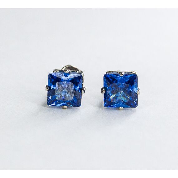 Серьги из гипоаллергенного ювелирного сплава серого цвета. Вставка- ювелирное стекло, цвет-синий. Диаметр серег-0,9см. Застежка- пусет.