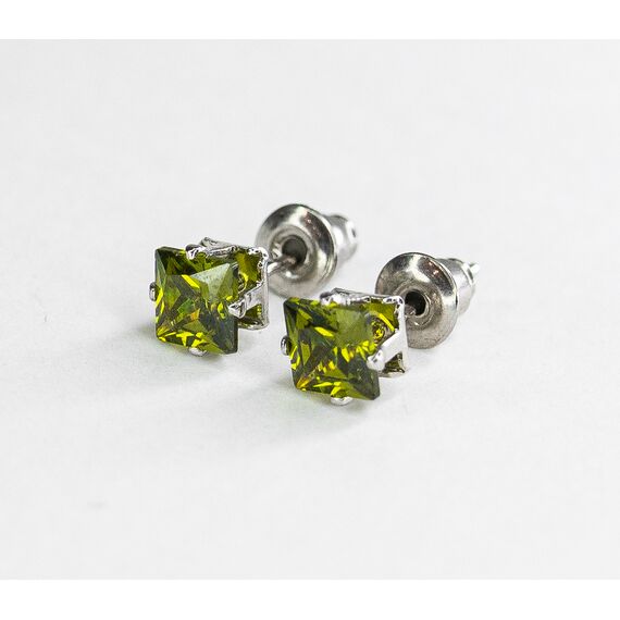 Серьги из гипоаллергенного ювелирного сплава серого цвета. Вставка- ювелирное стекло, цвет-зеленый. Диаметр серег-0,3см. Застежка- пусет.