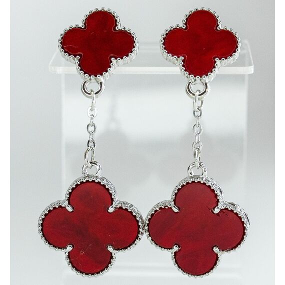Серьги из гипоаллергенного ювелирного сплава серого цвета. Вставка- ювелирный пластик красного цвета. Высота серег- 5,0см, ширина- 1,5см. Застежка- пусет.