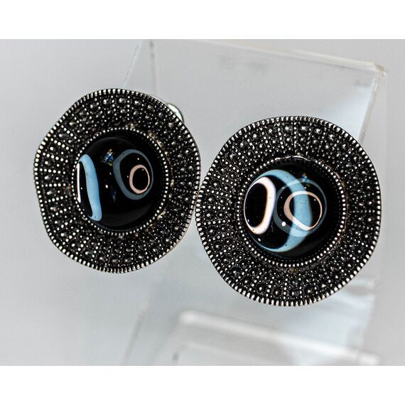 Серьги из гипоаллергенного ювелирного сплава серого цвета . Вставка-улексит( кошачий глаз) ,цвет-лондон блю. Итальянский замок (швенза-1,2см и застежка-клипса). Высота серег-2,5см. ширина-2,5см.Диаметр камня-1,5см.