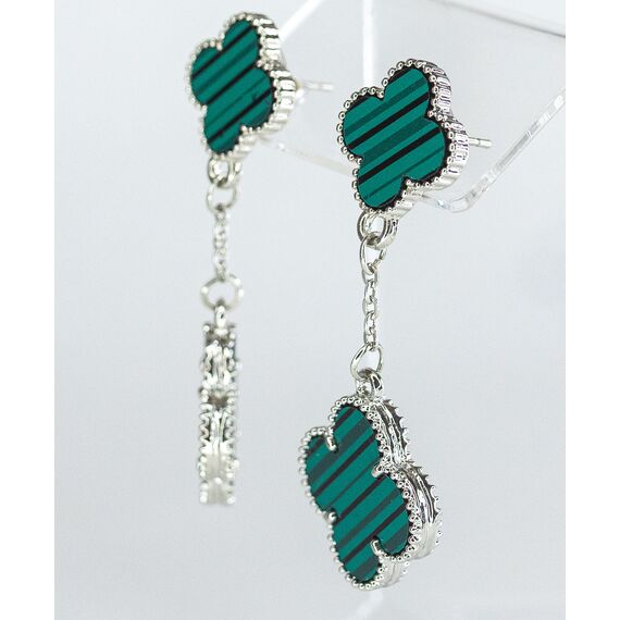 Серьги из гипоаллергенного ювелирного сплава серого цвета. Вставка- ювелирный пластик (имитация малахита) зеленого цвета. Высота серег- 5,0см, ширина- 1,5см. Застежка- пусет.