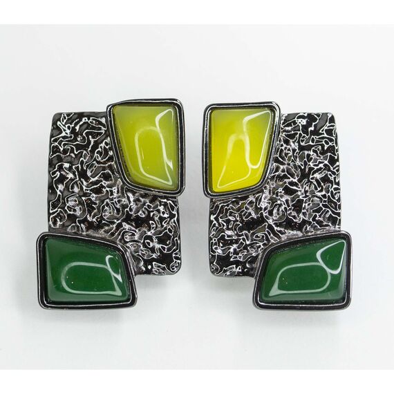 Серьги из гипоаллергенного ювелирного сплава черного цвета и эпоксидной смолы, цвет-желтый и зеленый. Высота серег-3,5см, ширина-2,5см. Итальянский замок (швенза-1,2см и застежка- клипса).