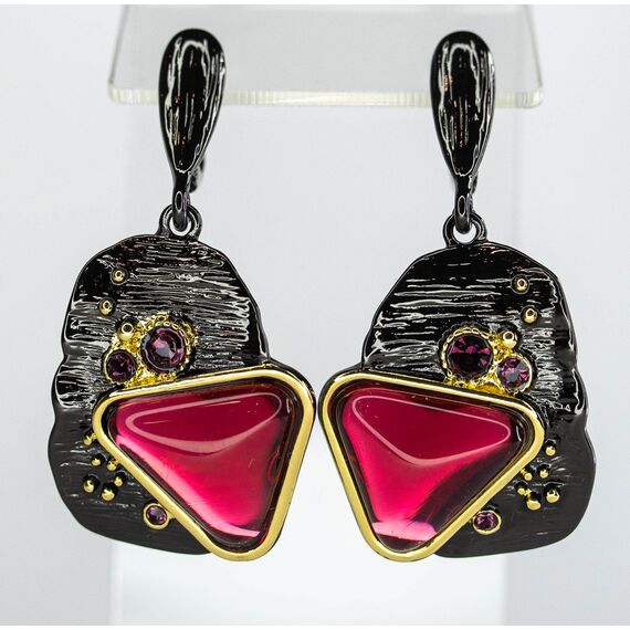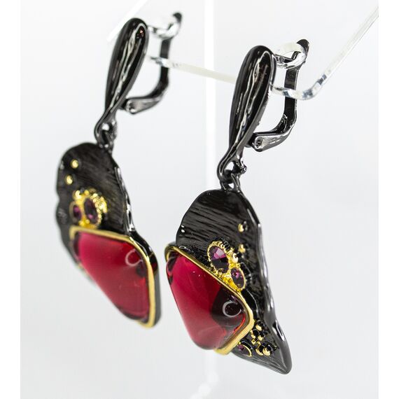 Серьги из гипоаллергенного ювелирного сплава черного и желтого цвета. Вставка- улексит ( кошачий глаз) красного цвета и ювелирное стекло фиолетового цвета. Высота серег -4,5см, ширина -2,0см. Английский замок ( штифт-1,0см).