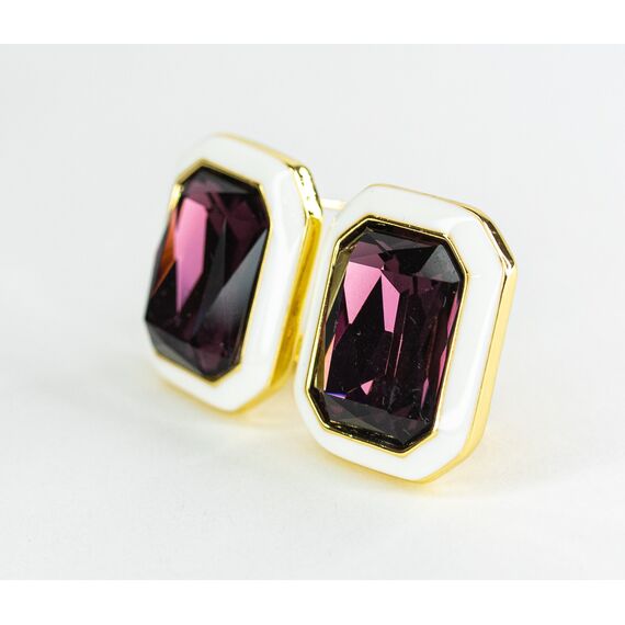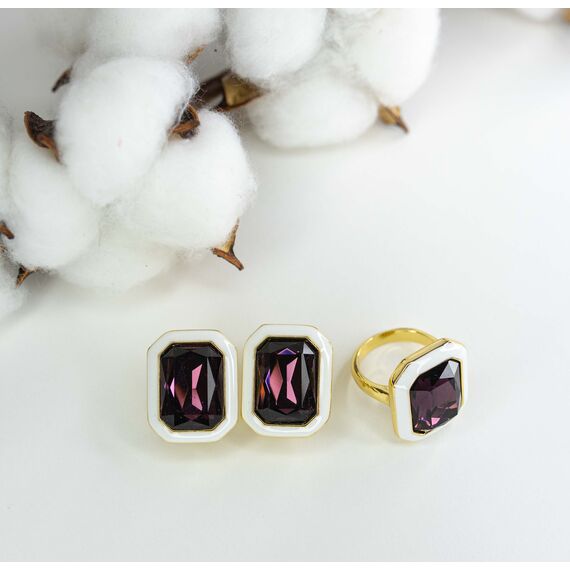 Серьги из гипоаллергенного ювелирного сплава желтого цвета. Вставка- ювелирное стекло, цвет- сиреневый. Покрытие эмалью белого цвета. Высота серег-2,5см, ширина-2см. Итальянский замок (швенза-1,2см и застежка- клипса).