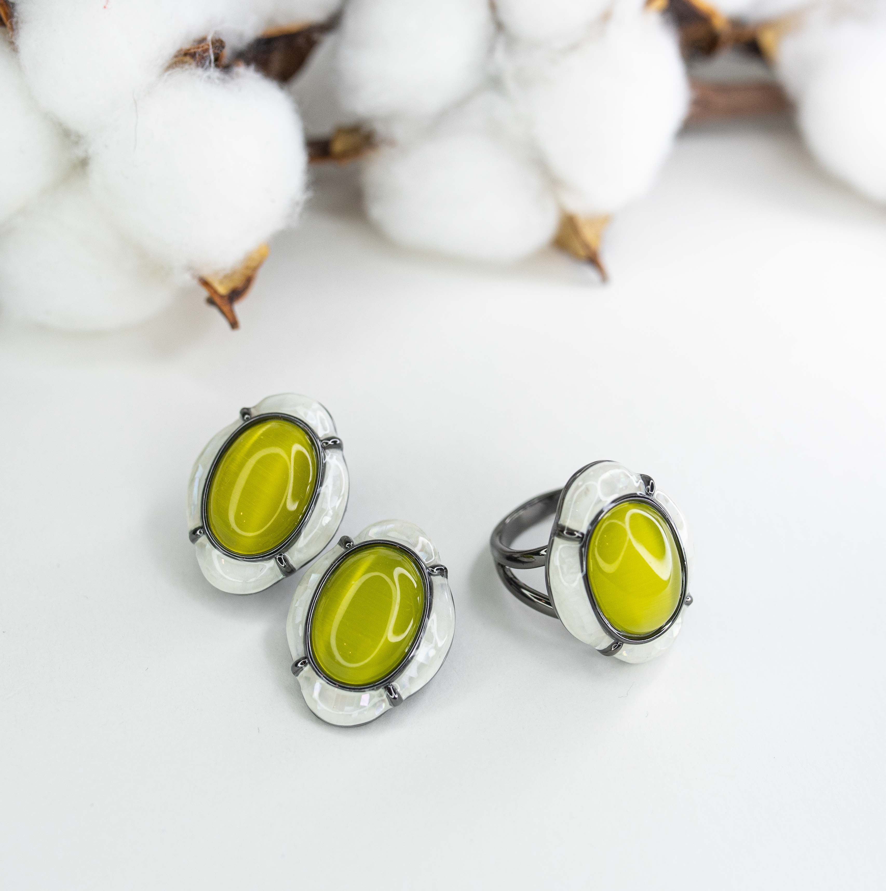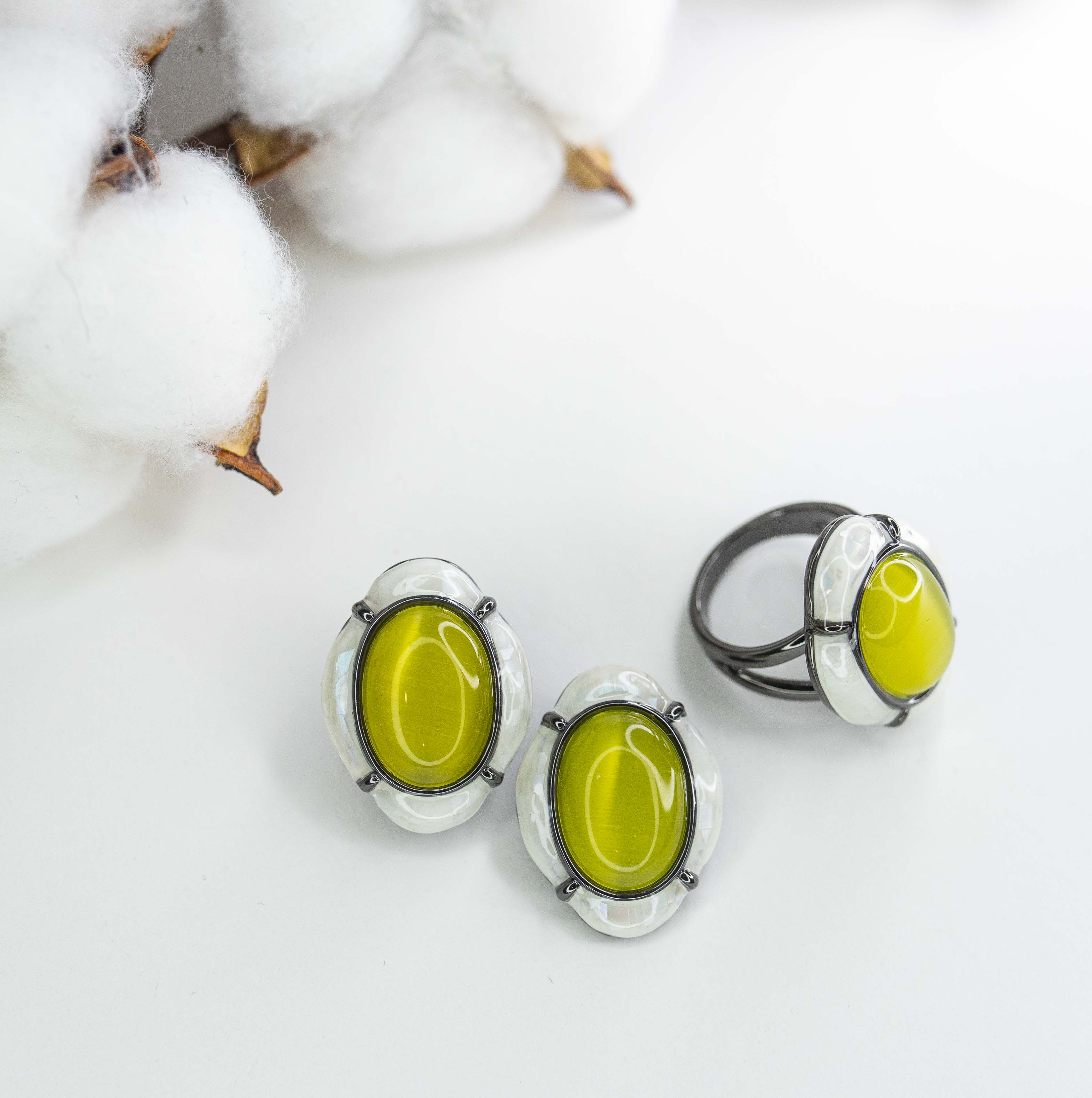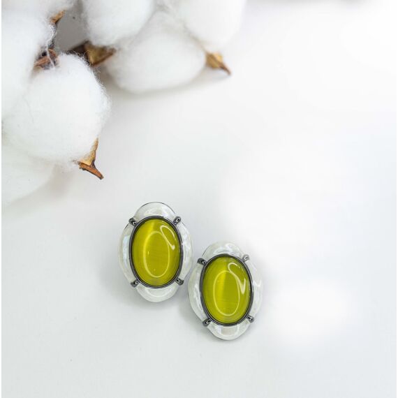 Серьги из гипоаллергенного ювелирного сплава черного цвета. Вставка- улексит( кошачий глаз) желтого цвета. Покрытие эмалью, цвет- белый. Высота серег-3см, ширина-2см. Итальянский замок (швенза-1,2см и застежка- клипса).