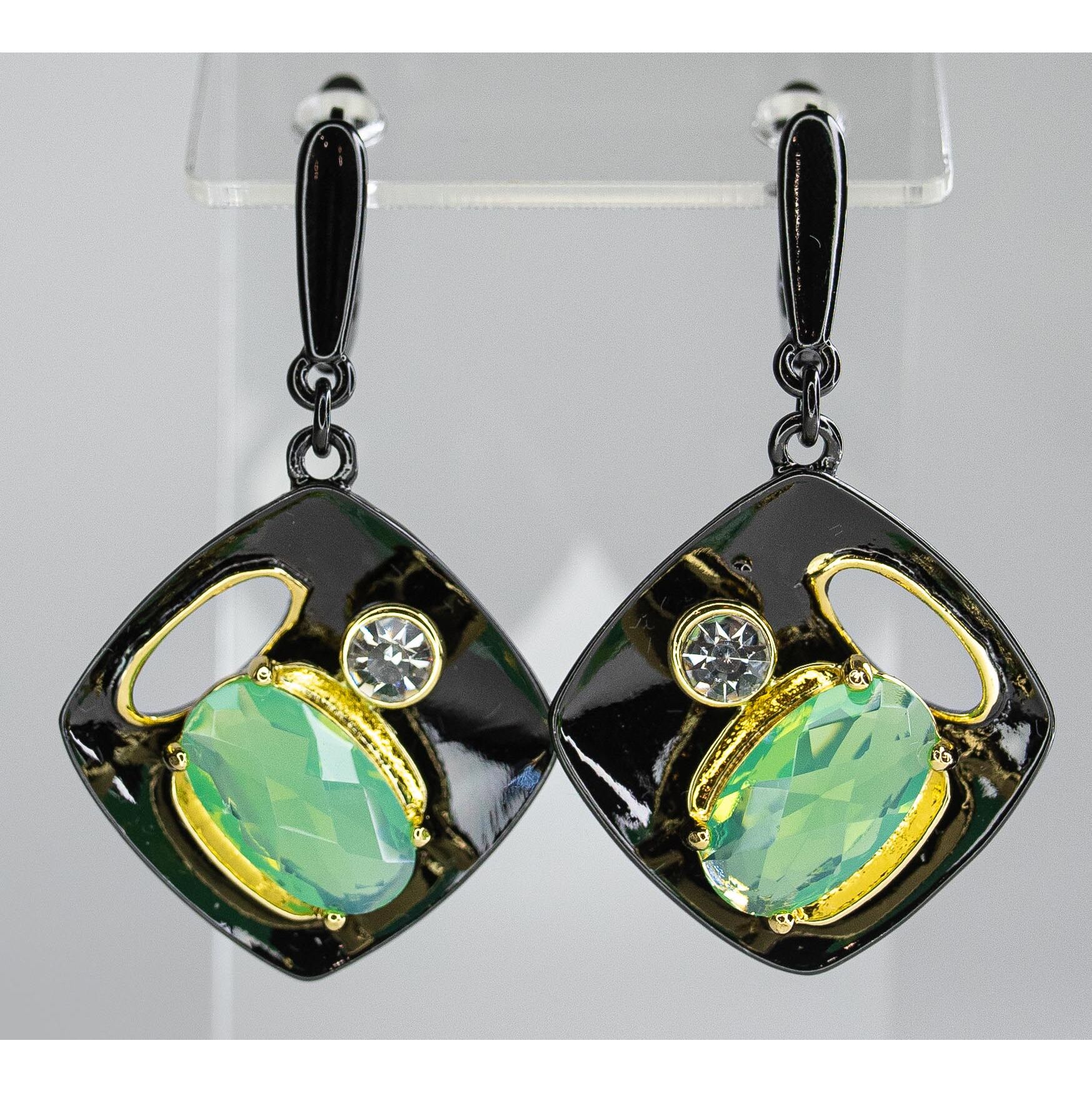 Серьги женские из гипоаллергенного ювелирного сплава черного цвета. Вставка- ювелирное стекло белого цвета и улексит ( кошачий глаз) зеленого цвета. Высота серег-4,5см, ширина-2,5см. Застежка- английская (швенза-1см).