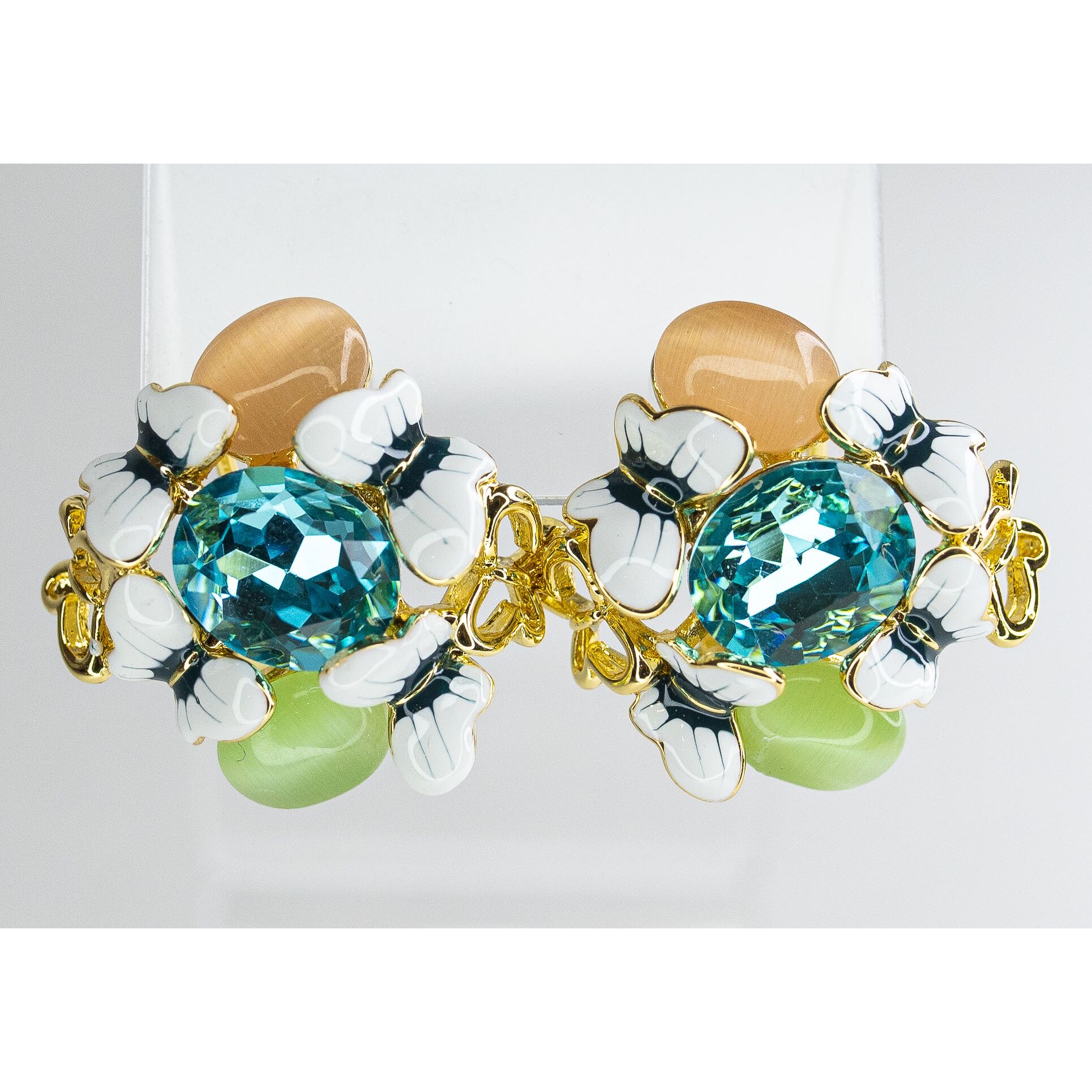 Серьги из гипоаллергенного ювелирного сплава желтого цвета. Вставка- ювелирное стекло, цвет- голубой и улексит ( кошачий глаз) салатового и бежевого цвета. Покрытие эмалью белого и черного цвета. Высота серег-2,5см, ширина-3см. Итальянский замок (швенза-1,2см и застежка- клипса).