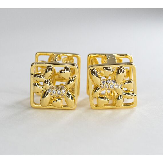 Серьги двухсторонние из гипоаллергенного ювелирного сплава, цвет-желтый. Вставка- ювелирное стекло белого цвета. Высота серег-1,2см, ширина-1,2см. Застежка- скоба.