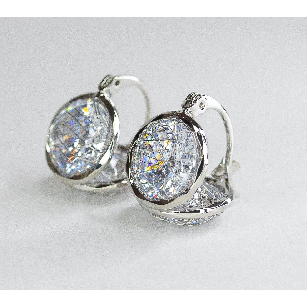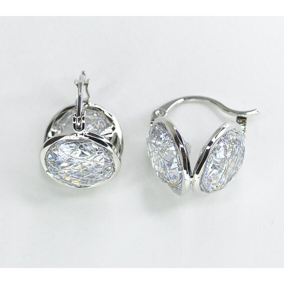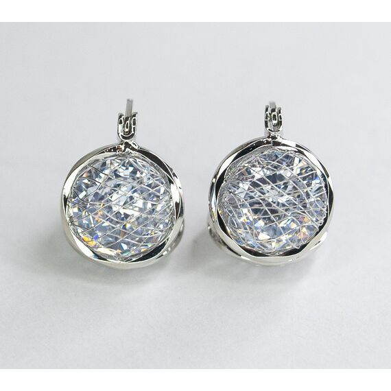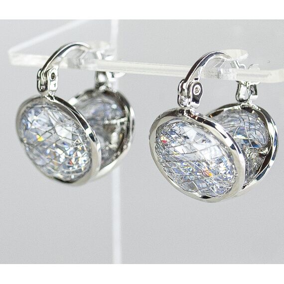 Серьги двухсторонние из гипоаллергенного ювелирного сплава, цвет-серый. Вставка- ювелирное стекло белого цвета. Высота серег-1,2см, ширина-1,2см. Застежка- скоба.
