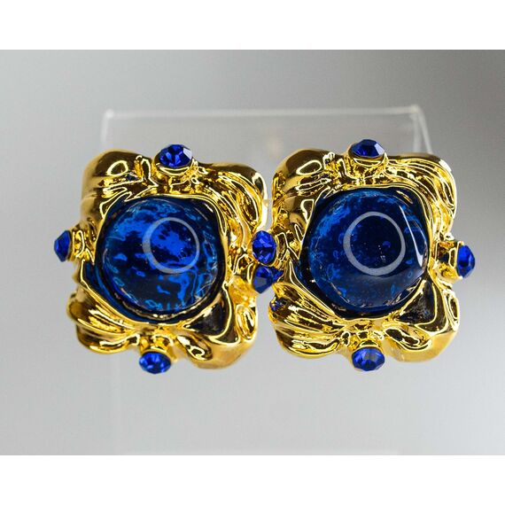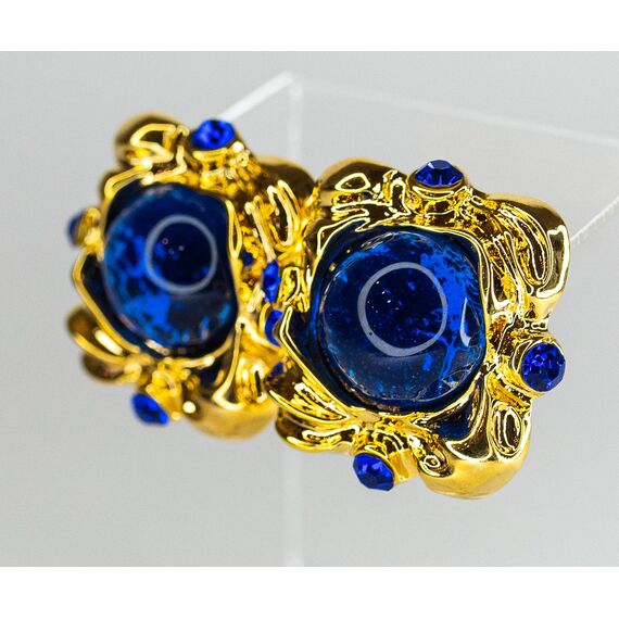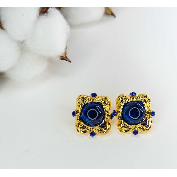 Серьги из гипоаллергенного ювелирного сплава, цвет-желтый. Вставка- ювелирное стекло синего цвета. Высота серег-3,0см, ширина-3,0см. Застежка- пусет.