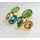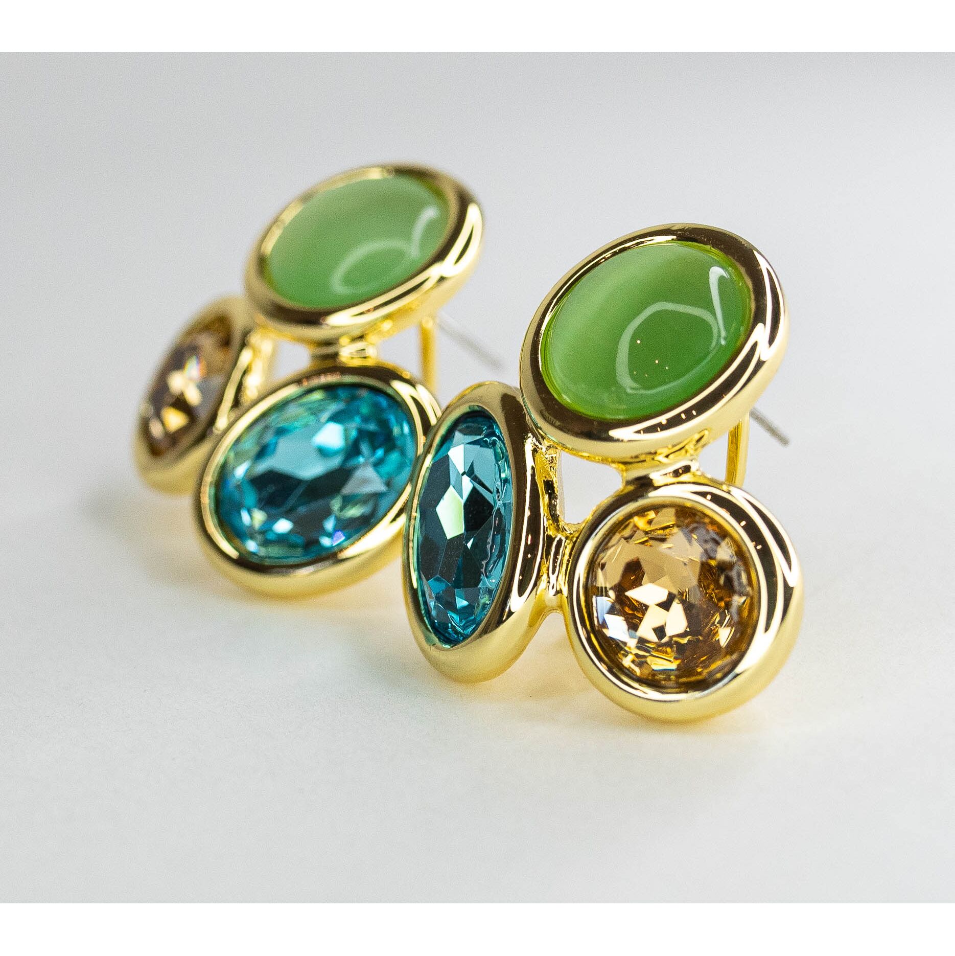 Серьги из гипоаллергенного ювелирного сплава желтого цвета. Вставка- ювелирное стекло , цвет- голубой, желтый и улексит (кошачий глаз) зеленого цвета. Высота серег-3см, ширина-3см. Итальянский замок (швенза-1,2см и застежка- клипса).