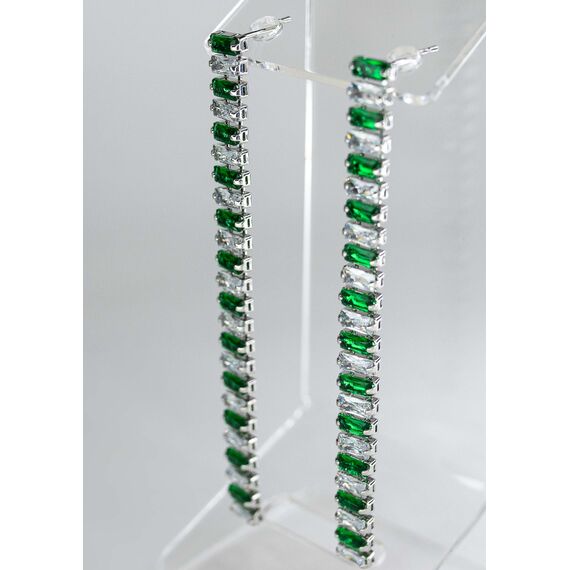 Серьги из гипоаллергенного ювелирного сплава серого цвета. Вставка- цирконы белого и зеленого цвета. Высота серег-15,0см, ширина-0,5см. Застежка- пусет.
