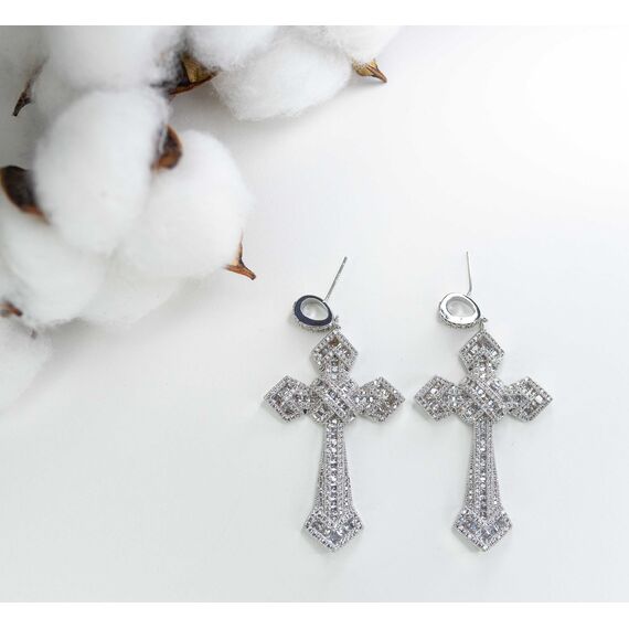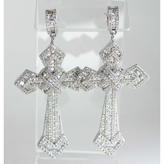 Серьги из гипоаллергенного ювелирного сплава серого цвета. Вставка- цирконы белого цвета. Высота серег-6,5см, ширина-3,0см. Застежка- пусет.