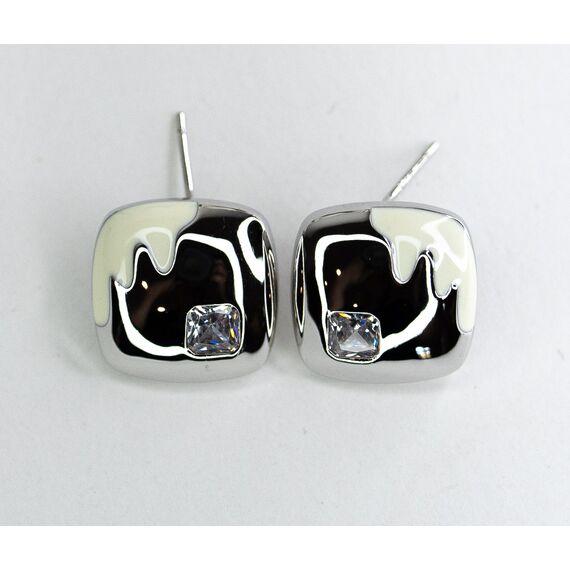Серьги из гипоаллергенного ювелирного сплава серого цвета. Вставка- ювелирное стекло белого цвета. Покрытие эмалью белого цвета. Высота серег-1,5см, ширина-1,5см. Застежка- пусет.