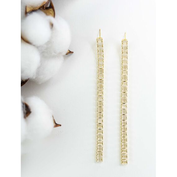 Серьги из гипоаллергенного ювелирного сплава желтого цвета. Вставка- улексит белого цвета. Высота серег-10,5см, ширина-0,5см. Застежка- пусет.