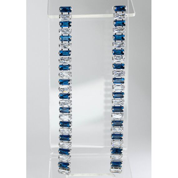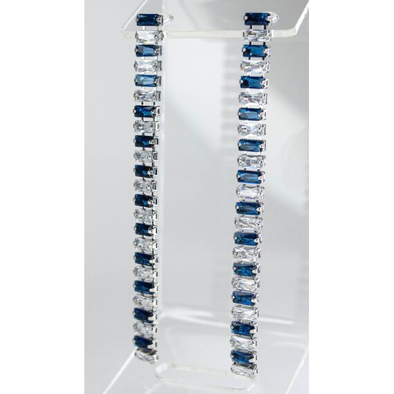 Серьги из гипоаллергенного ювелирного сплава серого цвета. Вставка- цирконы белого и синего цвета. Высота серег-15,0см, ширина-0,5см. Застежка- пусет.