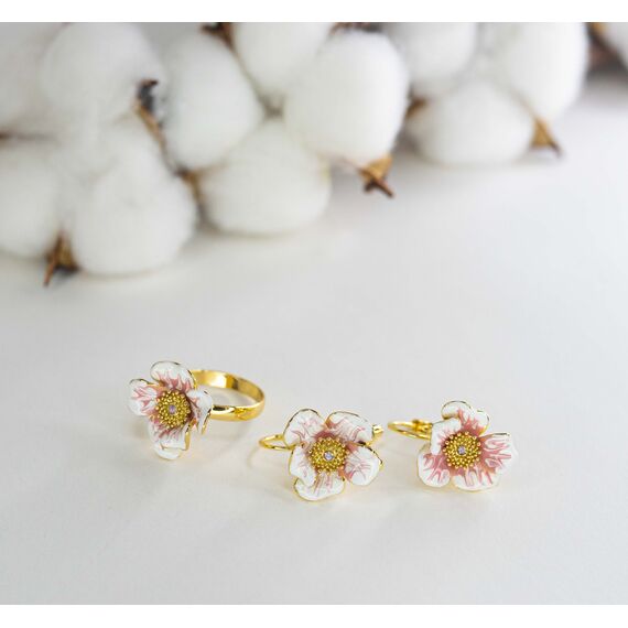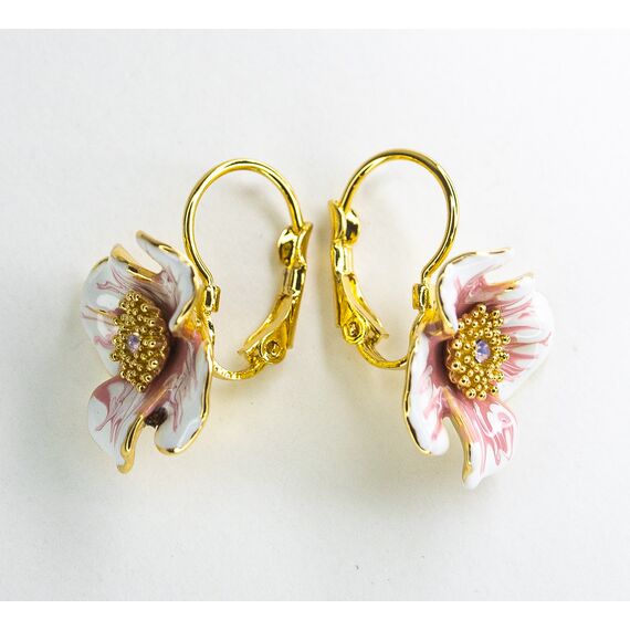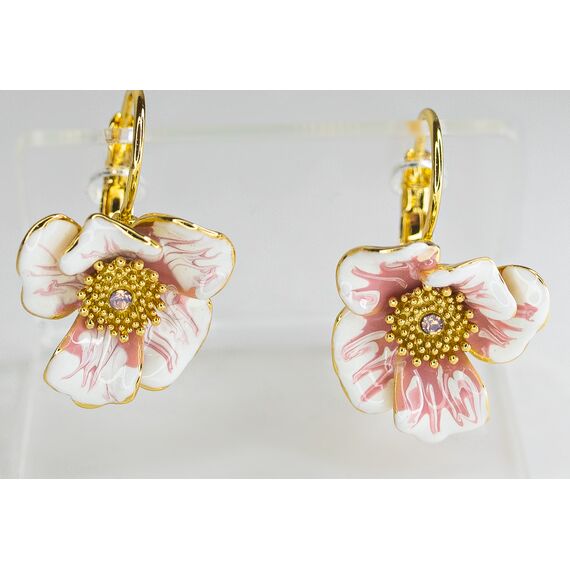 Серьги из гипоаллергенного ювелирного сплава желтого цвета. Вставка- ювелирное стекло розового цвета. Покрытие эмалью белого и розового цвета. Высота серег-2,5см, ширина-1,5см. Итальянский замок- клипса.