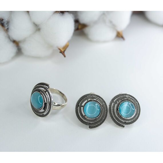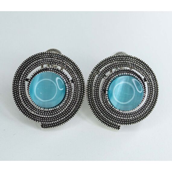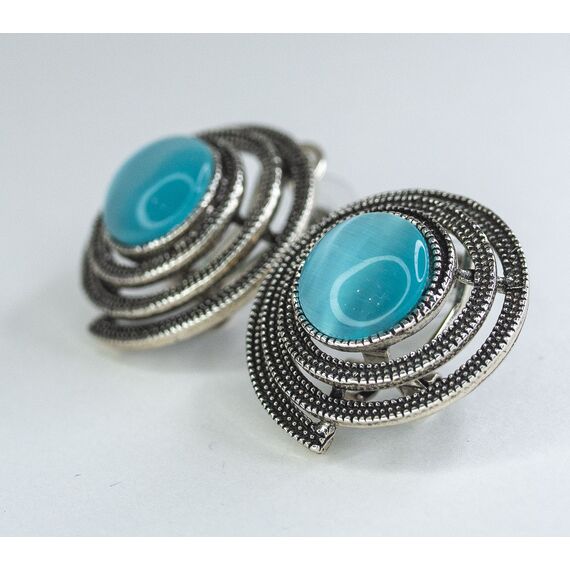 Серьги из гипоаллергенного ювелирного сплава серого цвета. Вставка- улексит ( кошачий глаз) голубого цвета. Диаметр серег- 2,5см, диаметр камня-1см. Итальянский замок ( швенза-1,2см и застежка- клипса).