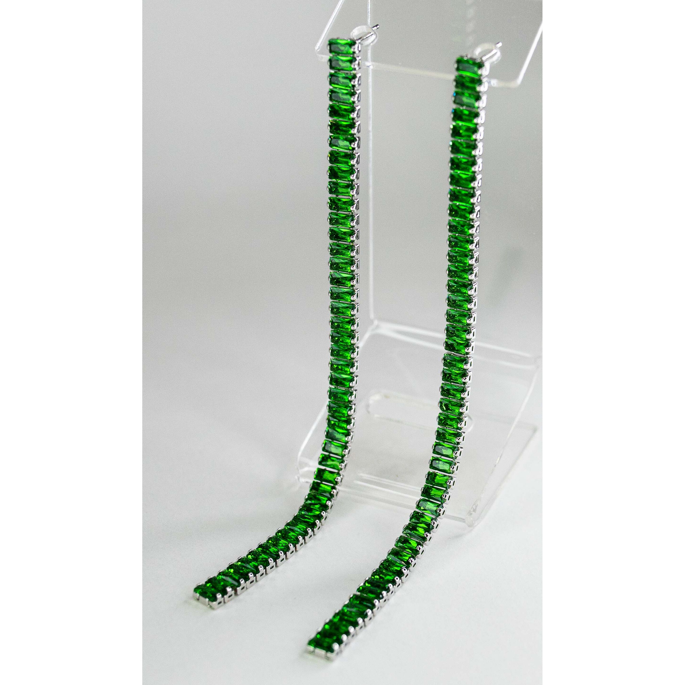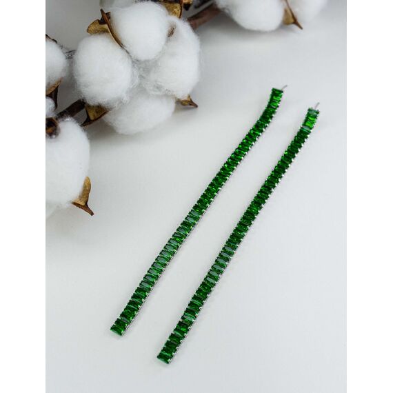 Серьги из гипоаллергенного ювелирного сплава серого цвета. Вставка -ювелирное стекло,цвет- зеленый. Высота серег-13см.,ширина -0.5см. Застежка-пусет.