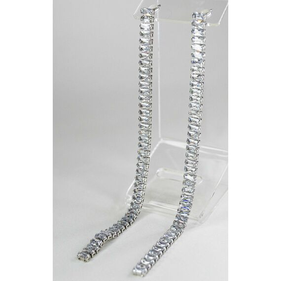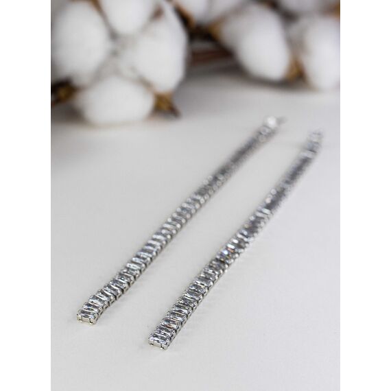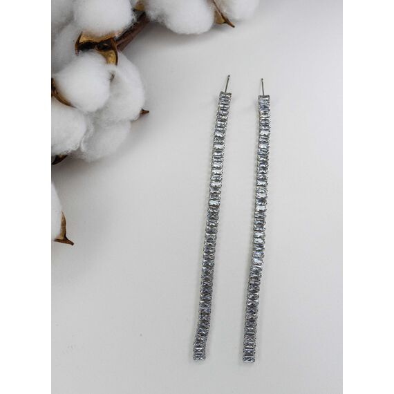 Серьги из гипоаллергенного ювелирного сплава серого цвета. Вставка -ювелирное стекло, цвет- белый. Высота серег-13см.,ширина -0,5см. Застежка-пусет.