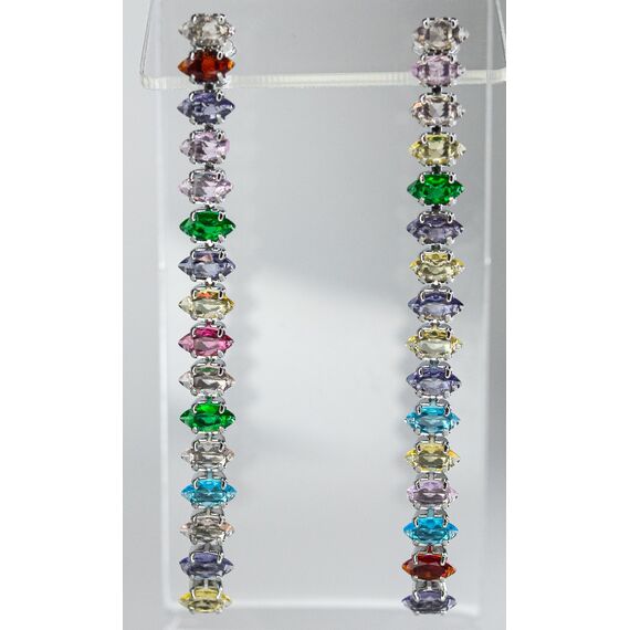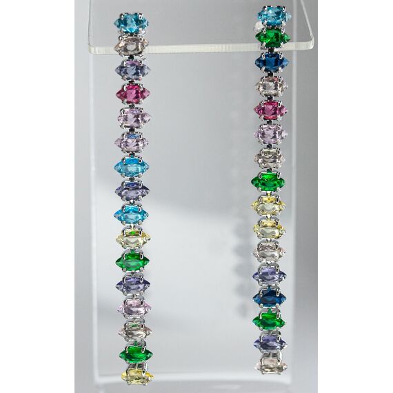 Серьги из гипоаллергенного ювелирного сплава серого цвета. Вставка- ювелирное стекло , цвет- микс. Высота серег-6,5см, ширина-0,5см. Застежка-пусет.