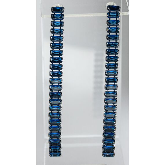Серьги из гипоаллергенного ювелирного сплава черного цвета. Вставка- ювелирное стекло , цвет- синий. Высота серег-6,5см, ширина-0,5см. Застежка-пусет.