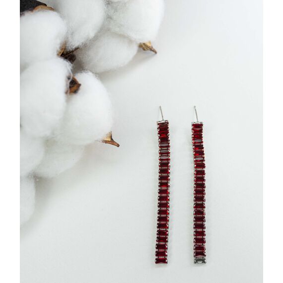 Серьги из гипоаллергенного ювелирного сплава серого цвета. Вставка- ювелирное стекло , цвет- красный. Высота серег-6,5см, ширина-0,5см. Застежка-пусет.