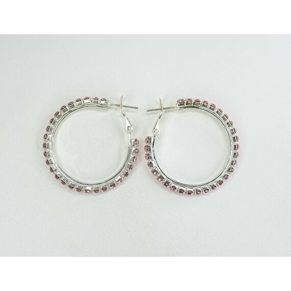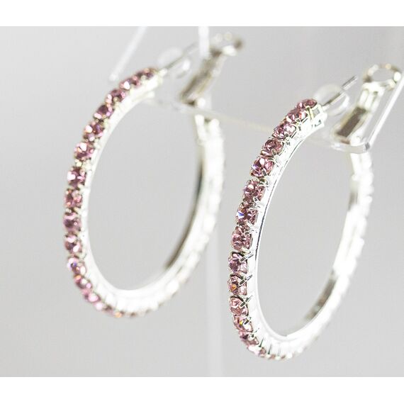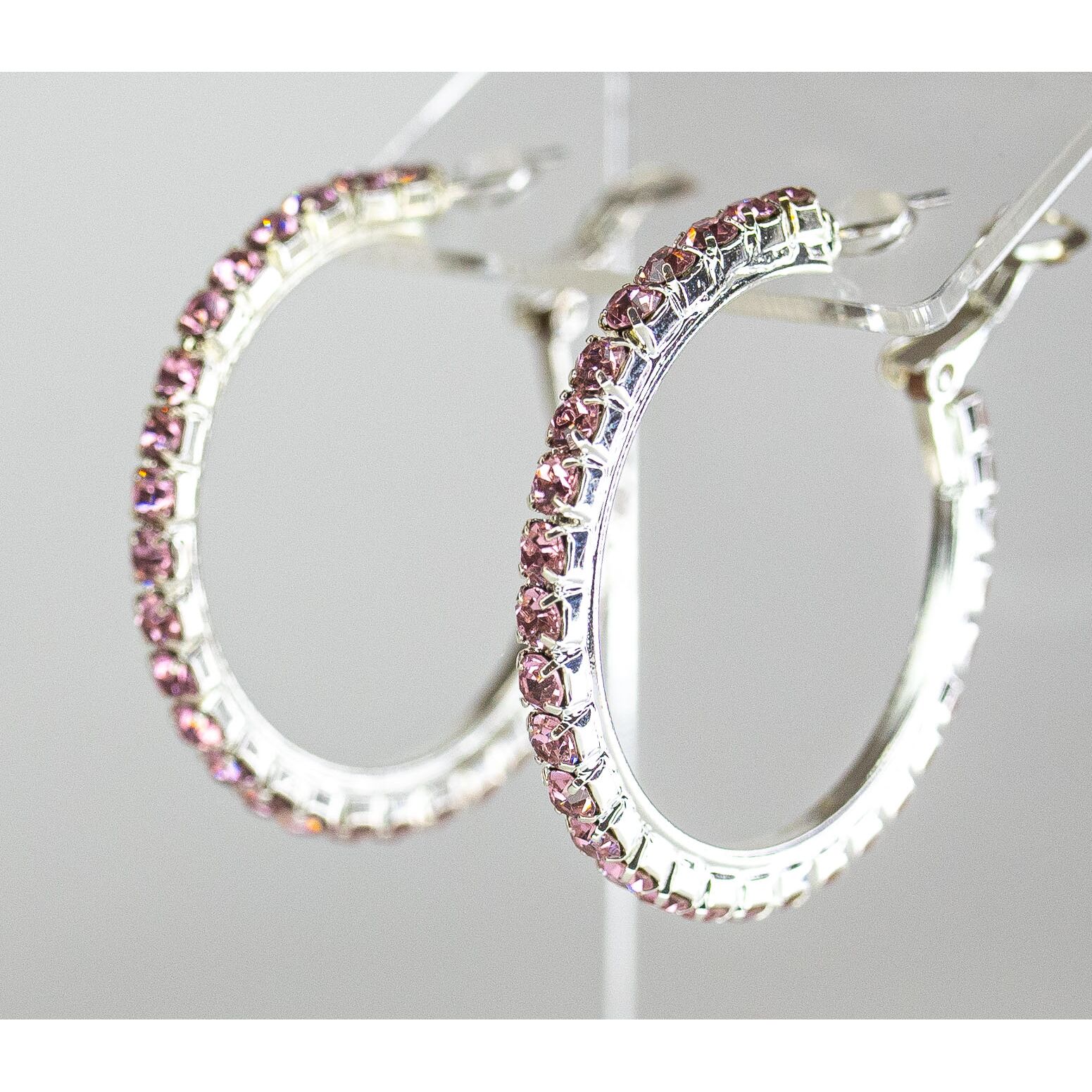 Серьги ( конго) из гипоаллергенного ювелирного сплава серого цвета. Вставка- ювелирное стекло розового цвета. Диаметр серег-4см. Застежка- клипса (швенза-1см).