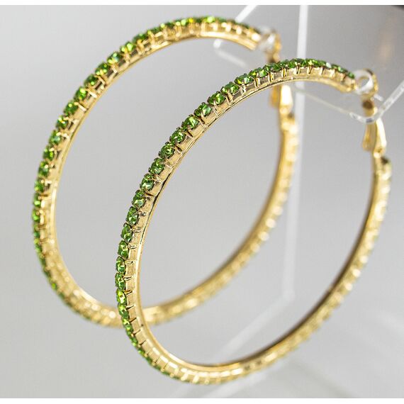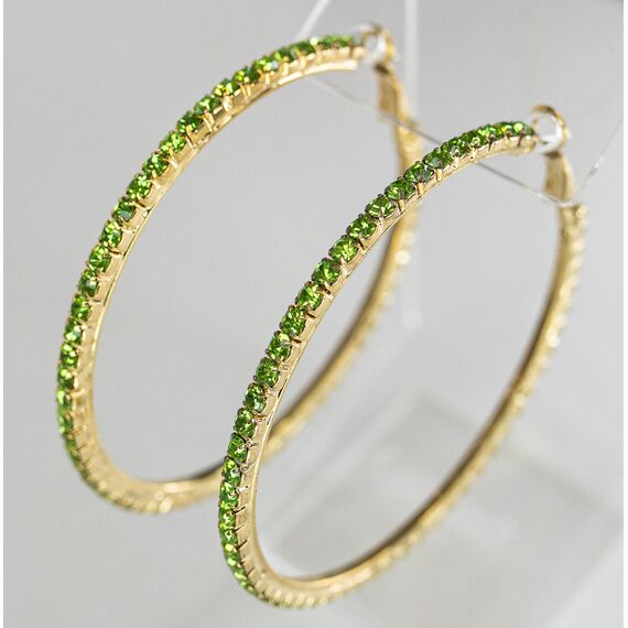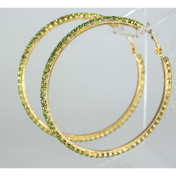 Серьги ( конго) из гипоаллергенного ювелирного сплава желтого цвета. Вставка- ювелирное стекло , цвет- зеленый. Диаметр серег-6,5см. Застежка- клипса( швенза-1см).