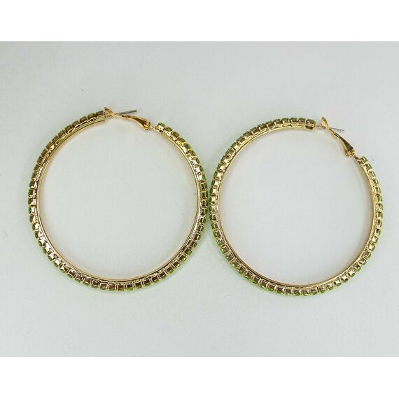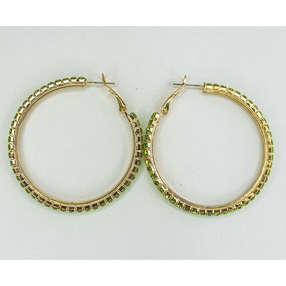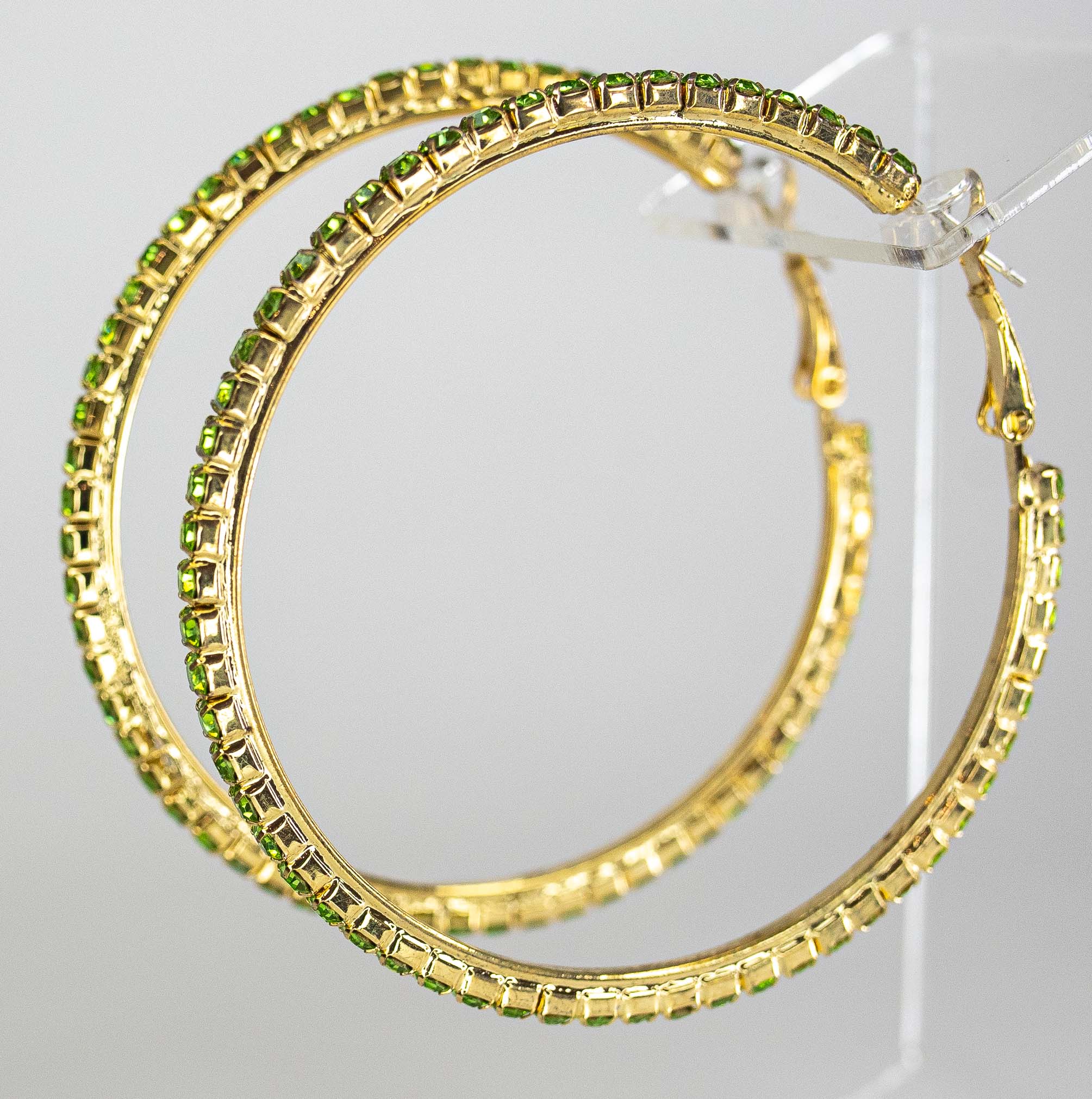 Серьги ( конго) из гипоаллергенного ювелирного сплава желтого цвета. Вставка- ювелирное стекло , цвет- зеленый. Диаметр серег-6см. Застежка- клипса( швенза-1см).