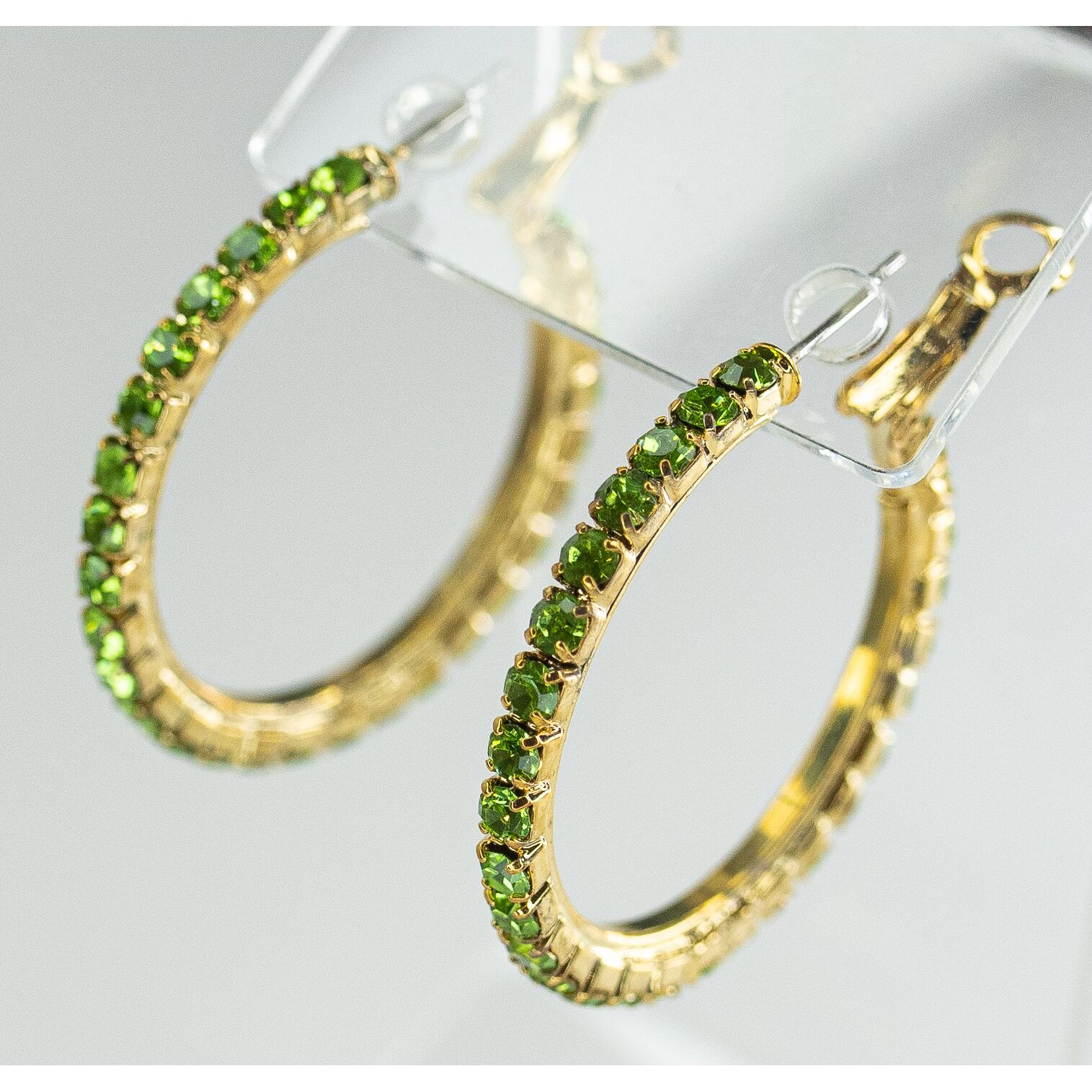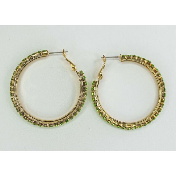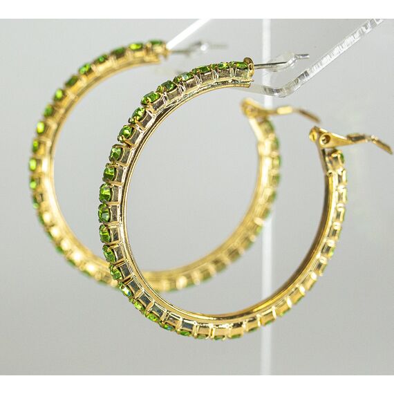 Серьги ( конго) из гипоаллергенного ювелирного сплава желтого цвета. Вставка- ювелирное стекло , цвет- зеленый. Диаметр серег-4см. Застежка- клипса( швенза-1см).