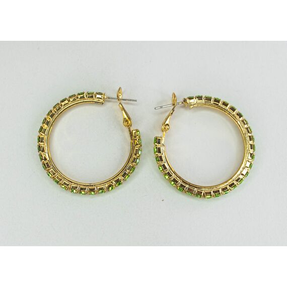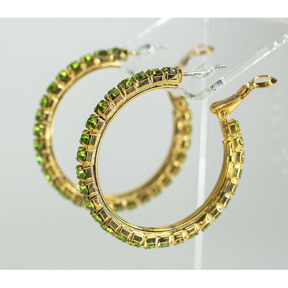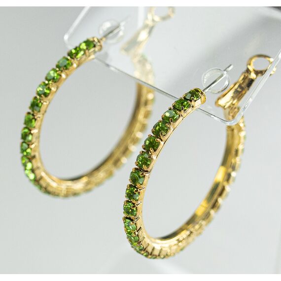 Серьги ( конго) из гипоаллергенного ювелирного сплава желтого цвета. Вставка- ювелирное стекло , цвет- зеленый. Диаметр серег-3см. Застежка- клипса( швенза-1см).