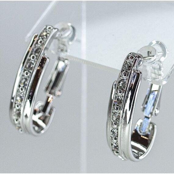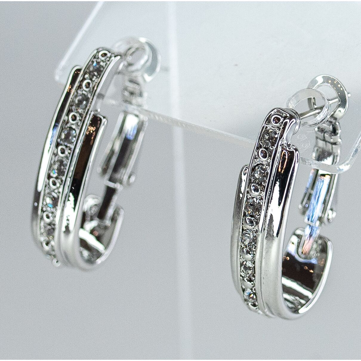 Серьги из гипоаллергенного ювелирного сплава серого цвета.Вставка- цирконы белого цвета. Высота серег-2,7см, ширина-0,6 см. Итальянский замок ( швенза-1,2см и застежка- клипса).